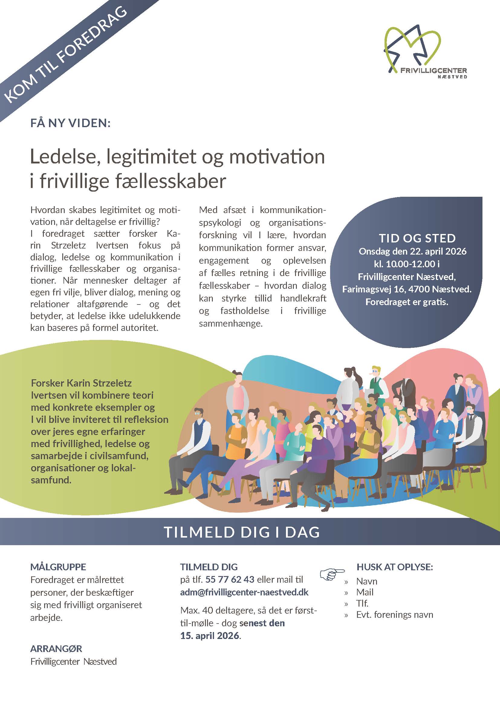 Målgruppe: Foredraget er målrettet personer, der beskæftiger sig med frivilligt organisatorisk arbejde